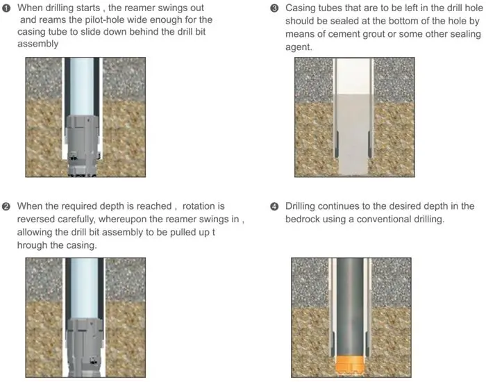 1. Когда начинается бурение, расширитель выдвигается и расширяет пилотное отверстие достаточно широко, чтобы обсадная труба могла соскользнуть вниз за узлом бурового долота.